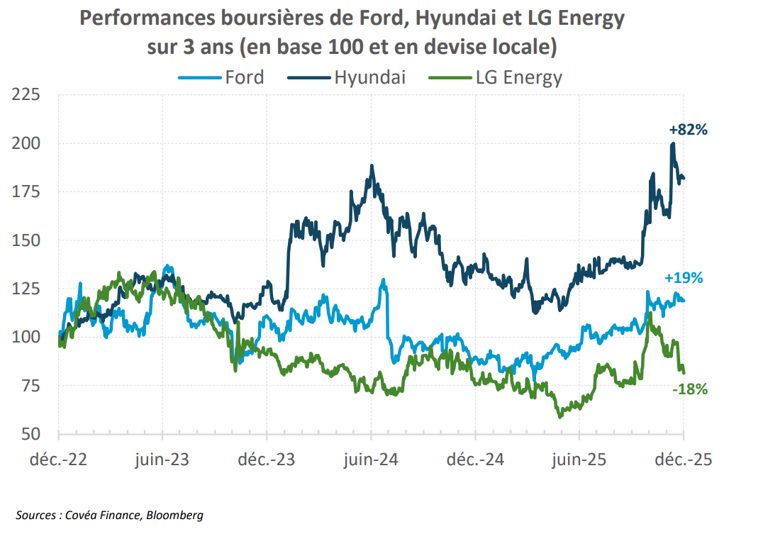En effet, les crédits d’impôt ont été réduits et les normes sur les émissions et la consommation de carburant assouplies. Dans ce contexte politique, les entreprises ont adapté leur modèle d’affaires. Un exemple très récent en témoigne, Ford abandonnant l’électrification totale de modèles emblématiques comme le F150, désormais orienté vers une technologie hybride. Dans le même temps, certaines usines du constructeur, initialement dédiées aux SUV électriques, sont reconverties pour produire des véhicules thermiques et hybrides, et une partie des capacités de production de batteries est réorientée vers le stockage, notamment pour les centres de données. Cette adaptation de la stratégie coûtera à Ford environ $19 Mds.