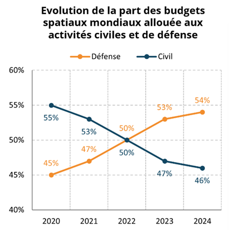 La maîtrise des communications par satellite est un enjeu majeur dans l’environnement géopolitique actuel (sécurité, pilotage des drones). Alors que depuis le début des années 90, les programmes civils représentaient toujours la majorité des budgets, en 2023 la part allouée à la défense est devenue majoritaire.