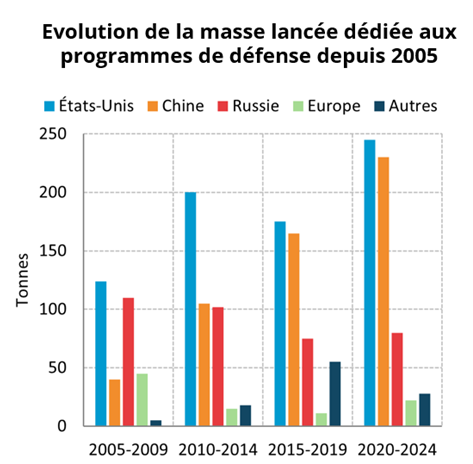Le nombre de satellites lancés pour des clients du secteur de la défense a été multiplié par 3,7x en 5 ans. En 2020, 46 satellites étaient lancés dans ce but contre 173 en 2024. En termes de masse envoyée dans l’Espace, c’est à peu de chose près une multiplication par 2 entre la période 2005-2009 et 2020-2024. Deux pays tirent leur épingle du jeu, les États-Unis (x2) et la Chine (x6).