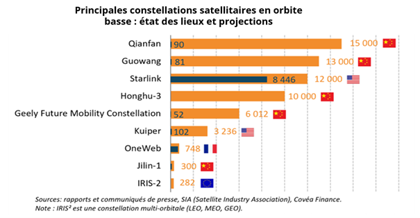 Les États-Unis dominent le secteur avec Starlink, société privée appartenant à Elon Musk, la constellation la plus avancée, déjà massivement déployée et offrant des services commerciaux à grande échelle. La Chine de son côté développe plusieurs mégaconstellations (Guowang, Qianfan, Honghu-3) avec une forte composante commerciale et des objectifs de souveraineté technologique et numérique.