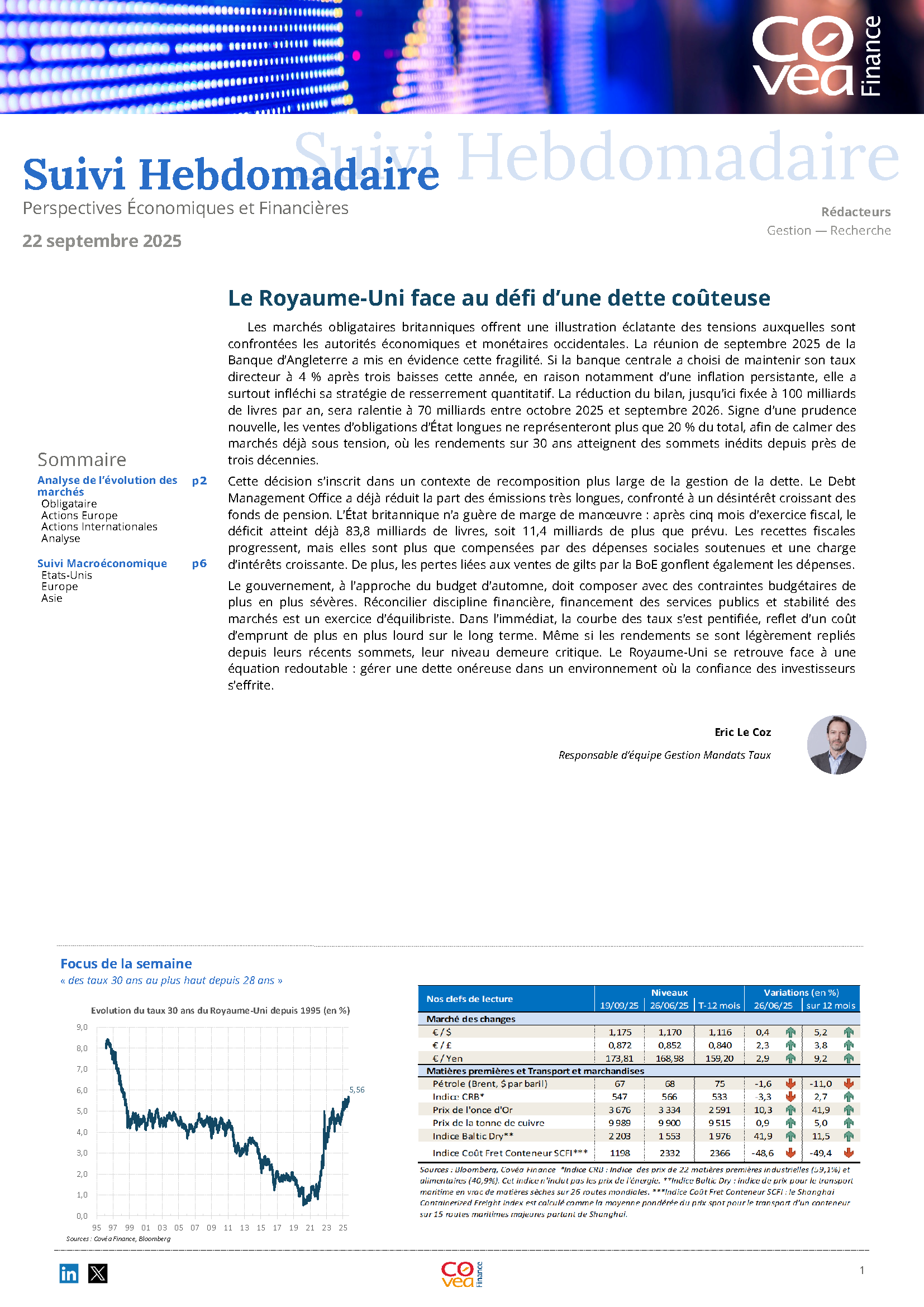 Le gouvernement, à l’approche du budget d’automne, doit composer avec des contraintes budgétaires de plus en plus sévères. Réconcilier discipline financière, financement des services publics et stabilité des marchés est un exercice d’équilibriste. Dans l’immédiat, la courbe des taux s’est pentifiée, reflet d’un coût d’emprunt de plus en plus lourd sur le long terme. Même si les rendements se sont légèrement repliés depuis leurs récents sommets, leur niveau demeure critique. Le Royaume-Uni se retrouve face à une équation redoutable : gérer une dette onéreuse dans un environnement où la confiance des investisseurs s’effrite.