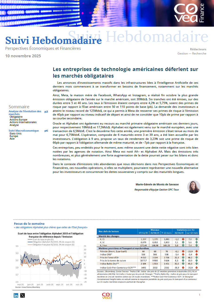 Dans le contexte d’émissions très abondantes que nous décrivons dans nos Perspectives Economiques et Financières, ces nouvelles opérations, si elles se multiplient, pourraient représenter une nouvelle alternative pour les investisseurs et concurrencer les dettes souveraines y compris sur des maturités longues.